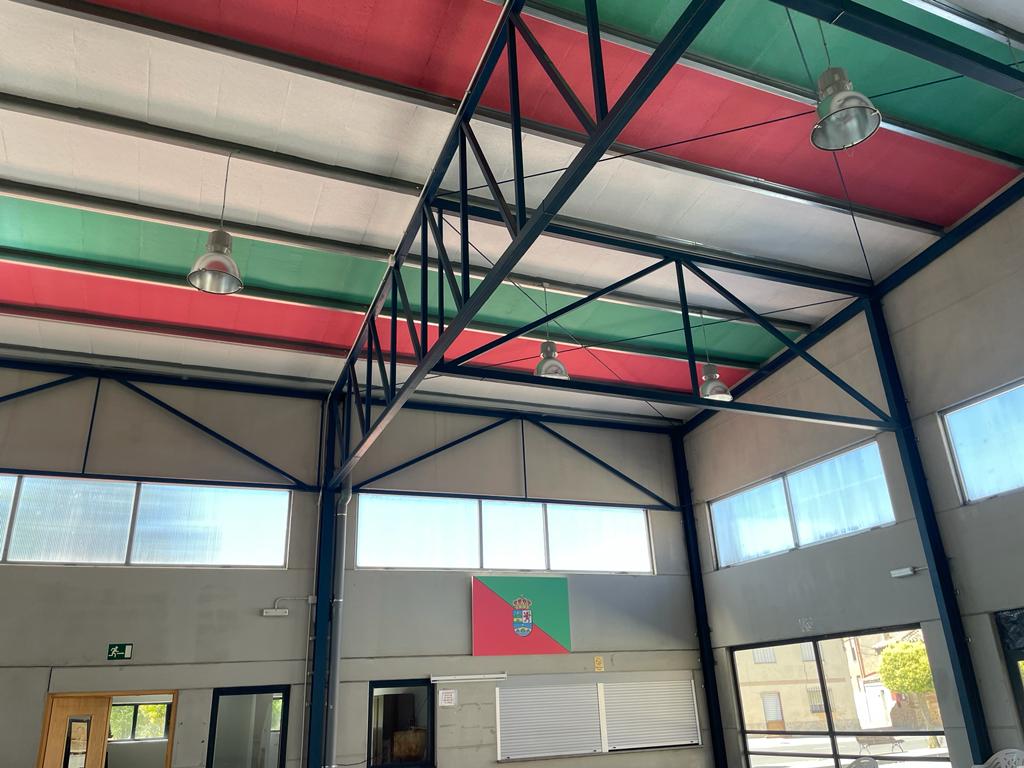 Por esta razón se decidió personalizar la instalación utilizando los colores de la bandera del municipio para las islas situadas en el techo, como podemos ver en las deferentes imágenes del artículo. En cuanto a las islas acústicas situadas en las paredes del pabellón, al tener estas un acabado blanco exterior se facilitaba especialmente el serigrafiado de su superficie. El equipo de impresión permitió serigrafiar imágenes fotográficas de los lugares emblemáticos del municipio. Un resultado personalizado y una imagen muy vinculada a la localidad.