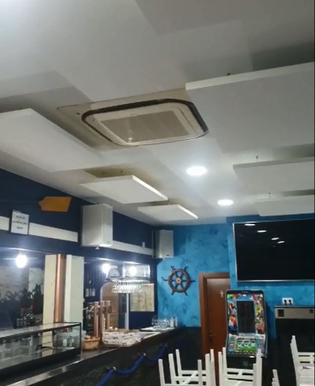 Se optó por utilizar islas acústicas descolgadas del techo del local. Las islas escogidas son del tipo Absortec-Ceiling H. Estos elementos permiten ser utilizados como un recurso decorativo más. Como en este caso el local disponía de una carga de color muy fuerte, la decisión final fue apostar por un color más neutro. Por esta razón las islas instaladas se seleccionaron en color blanco, y de esta forma no cargar en exceso cromáticamente el local.