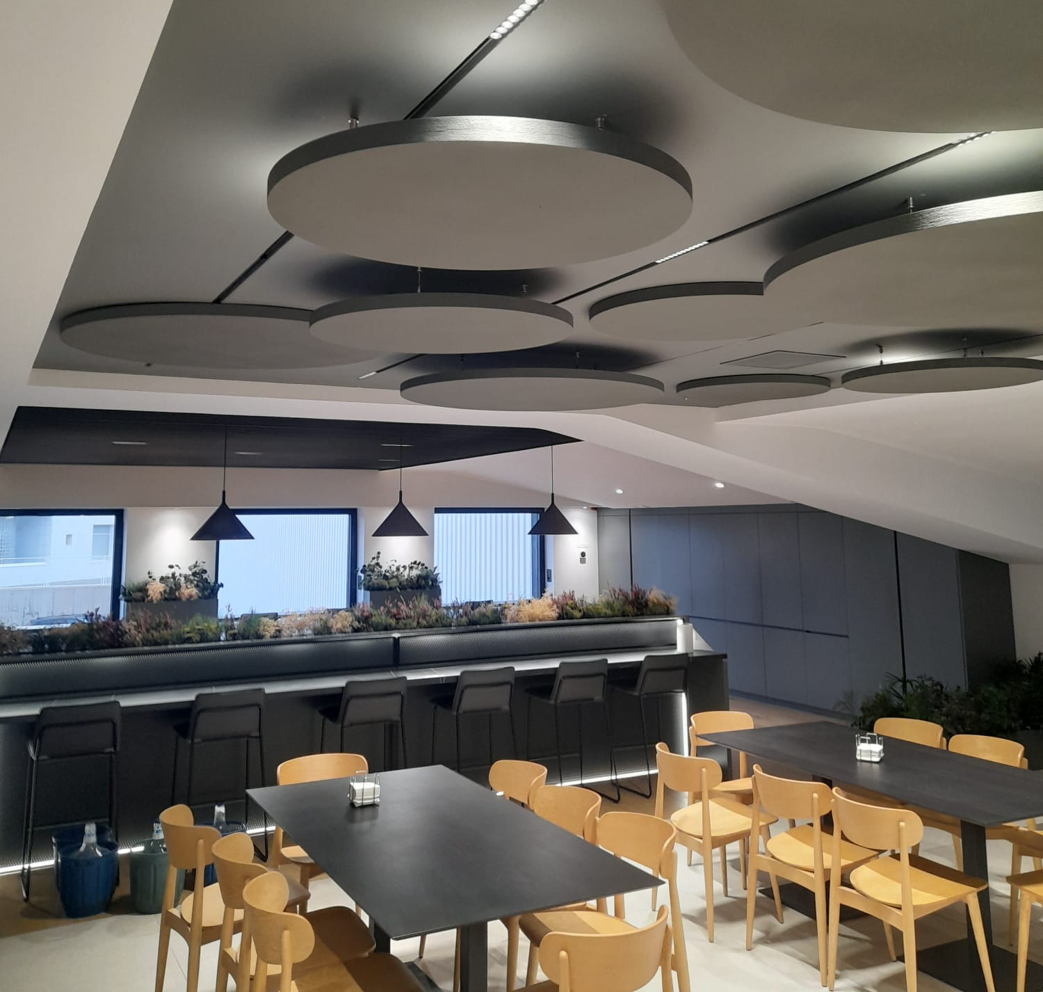 Por otro lado, en los techos, se han instalado islas acústicas descolgadas, también de la gama ABSORTEC. Las elegidas fueron las Ceiling-H que permiten su impresión en color. Como podemos ver en las imágenes el acabado estético de la solución. Se puede apreciar su elegancia y que está alineado a la estética del entorno.