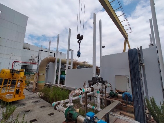 En nuestro caso la instalación del apantallamiento acústico demostró ser la respuesta a este desafío. En este caso, se optó por paneles desmontables, que tienen un efecto doble. Por un lado, el principal se consigue reducir el ruido. Pero además, permitirán el mantenimiento de los equipos en el interior de la instalación final. Esta elección estratégica aseguró la practicidad a largo plazo.